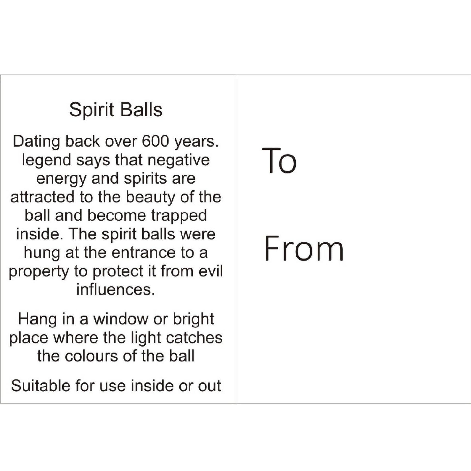 The tradition of the Spirit Ball is deeply rooted, dating back over 600 years in history. These beautiful orbs were traditionally hung in windows and gardens to ward off or trap negativity, demons, and evil spirits, inviting protection, good luck, and prosperity into the home.