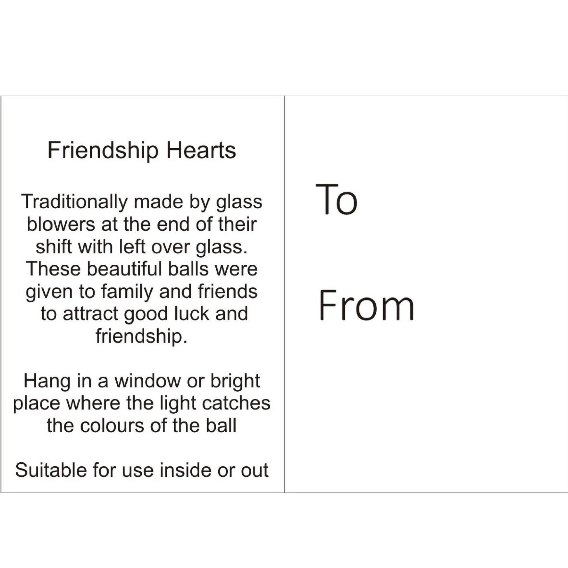 Celebrate a bond with this stunning, handcrafted glass friendship heart. Measuring approximately (), each piece is a unique creation, individually mouth blown by skilled artisans in Eastern Europe.