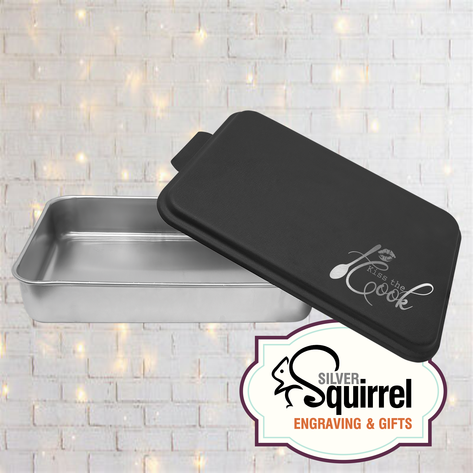 Fun and functional 9x13 personalized aluminum baking/cake pan. These premium baking pans have snug-fitting lids with a high-quality powder coating finish for maximum durability. No painted lids that scratch easily here! Bring your pan to a gathering and always take YOUR pan home.